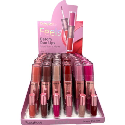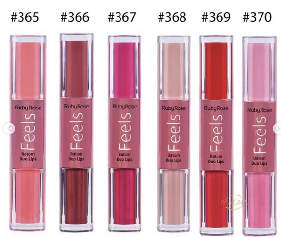 La línea Feels hermosos tonos de labial duo, con un lado líquido mate y el otro líquido metálico.