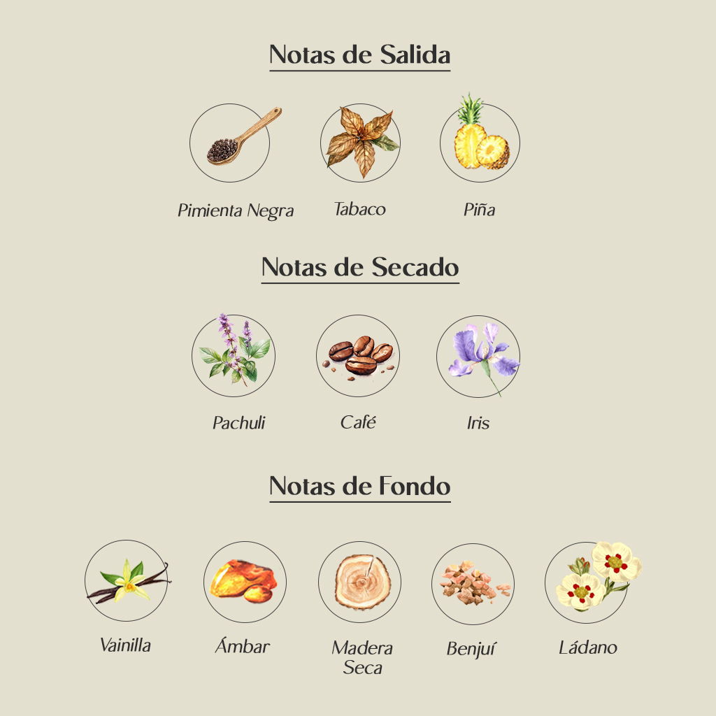 Base: Ámbar, Vainilla, Maderas Secas, Benjuí, Ládano