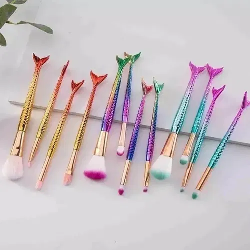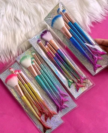 Set de 4 hermosas brochas y pinceles de maquillaje cola de sirena tornasol, textura suave, fácil de usar y controlar, mango con diseño de escamas u cola de Sirena. Brochas para aplicar tu maquillaje, rubor, base, y sombras. Con este Set de maquillaje Cola de sirena de colores variados y brillantes, aplica tu maquillaje de manera más precisa según sea el tipo de aplicación.